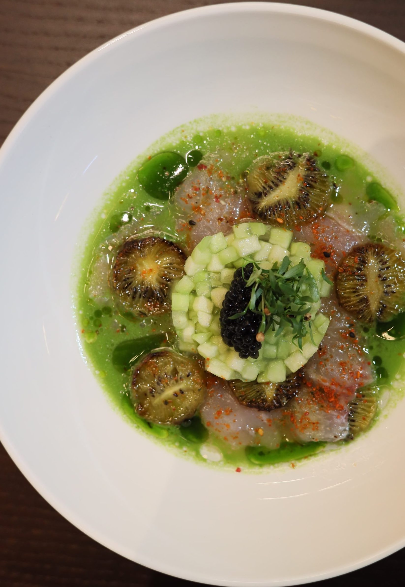lightly cured sea bass in aromatic coriander, confit kiwi, and green apple-cucumber chutney